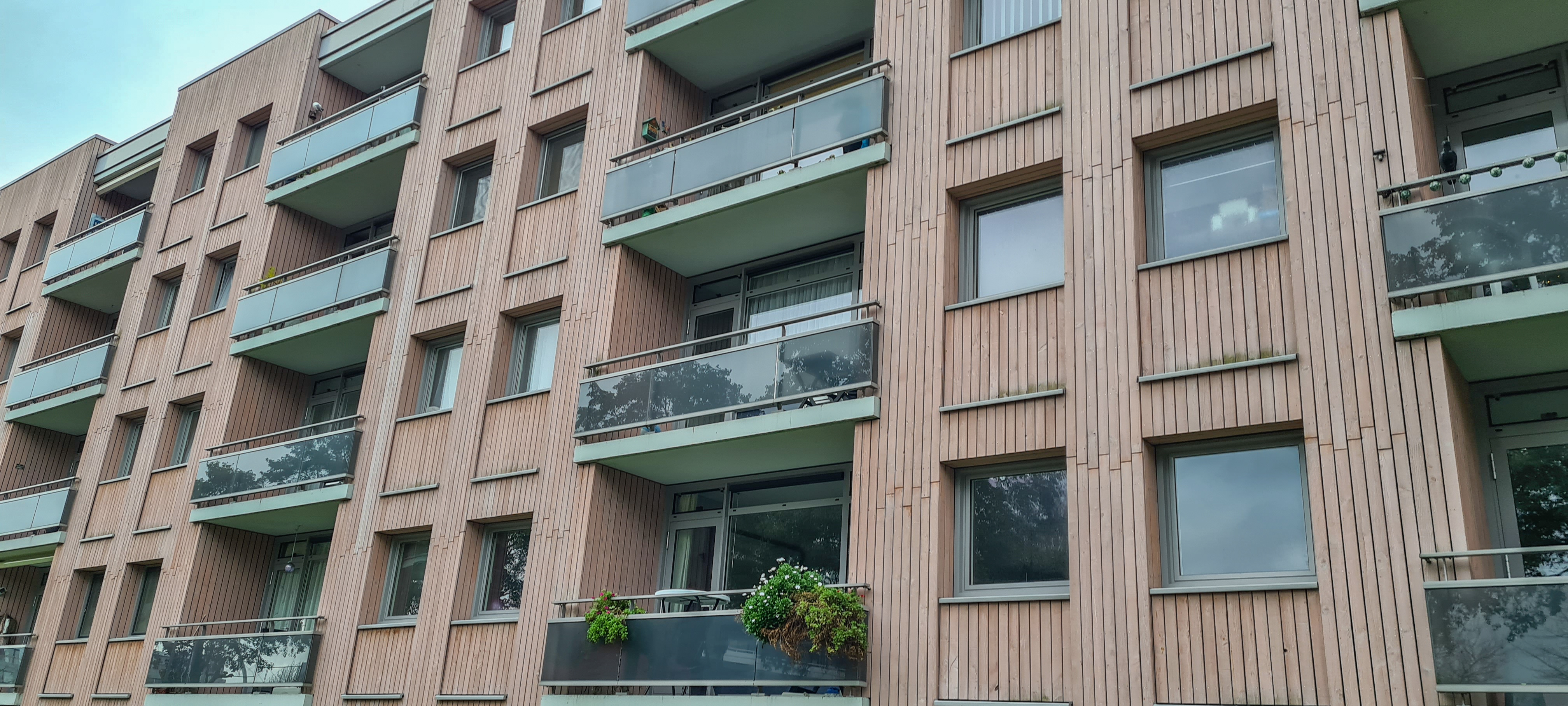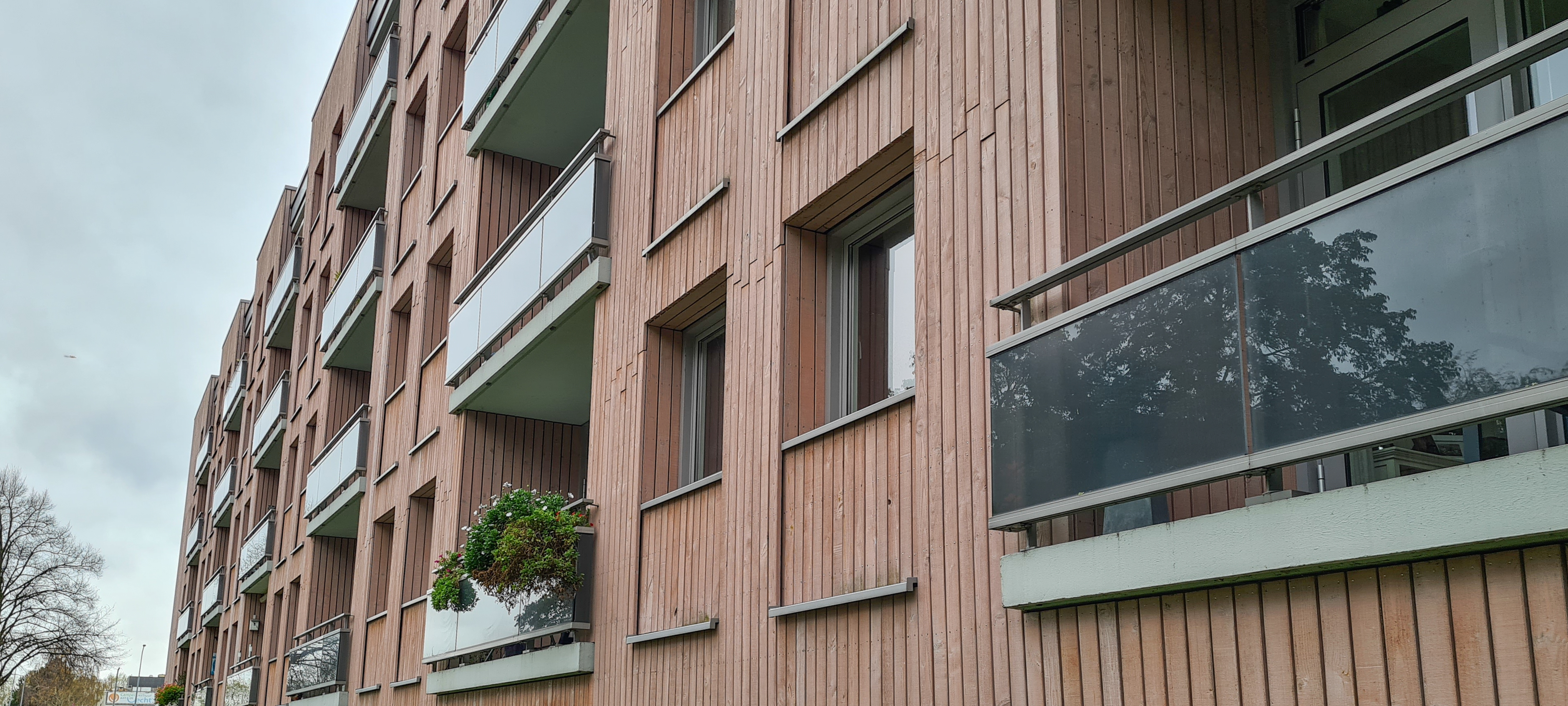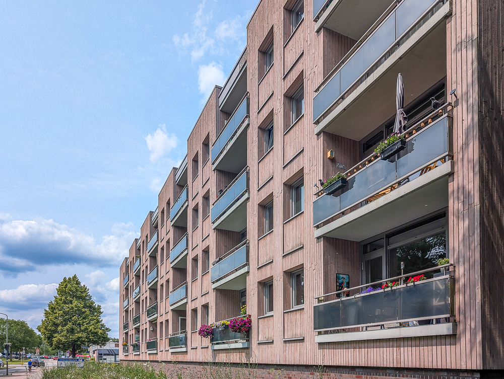 Woningbouw Weesp besloot na 45 jaar het appartementencomplex Sinnigveld in Weesp (72 woningen, 17 garages) te renoveren. FKG Architecten won de selectie voor deze renovatie. Hout was vanaf het begin het uitgangspunt. Op advies van Leegwater Houtbereiding is Douglas sorted Grade uit het Duitse Zwarte Woud toegepast als gevelbekleding. Leegwater behandelde het Douglas rondom: verduurzaming met Woodlife HL-50 (zonder metaalzouten), brandvertraging met Flame Delay PT (ook het rachelwerk) en voor de afwerking drie lagen Sansin SDF (twee keer roodbruin, één keer whitewash). De kleur roze-beige van de behandeling met Sansin SDF sluit nauw aan bij de tint van de baksteen.