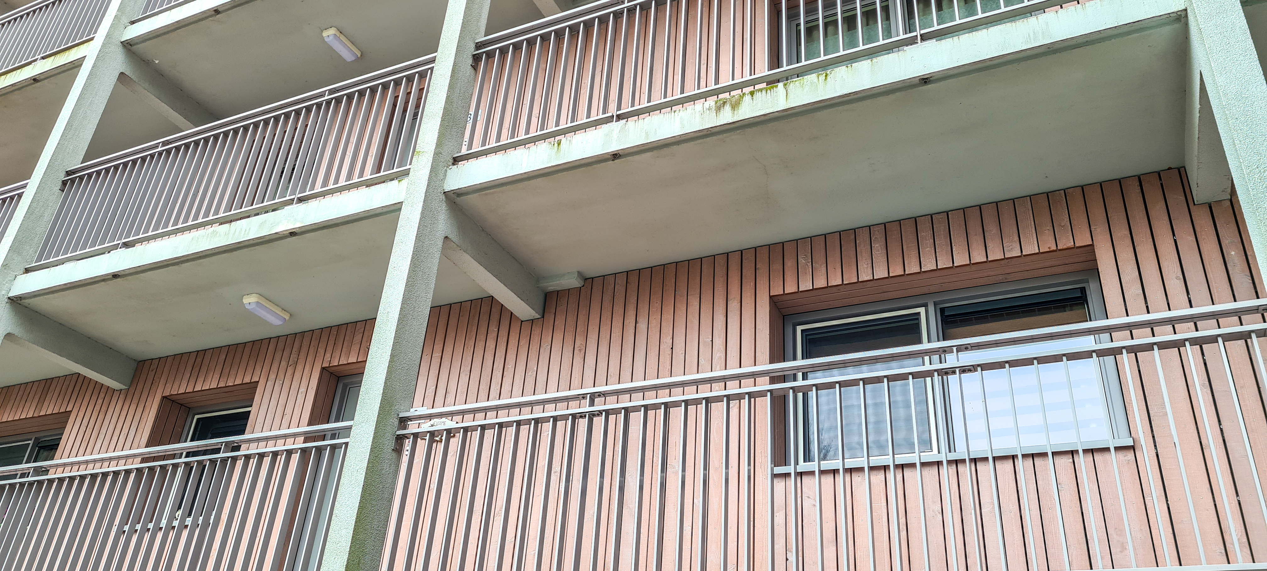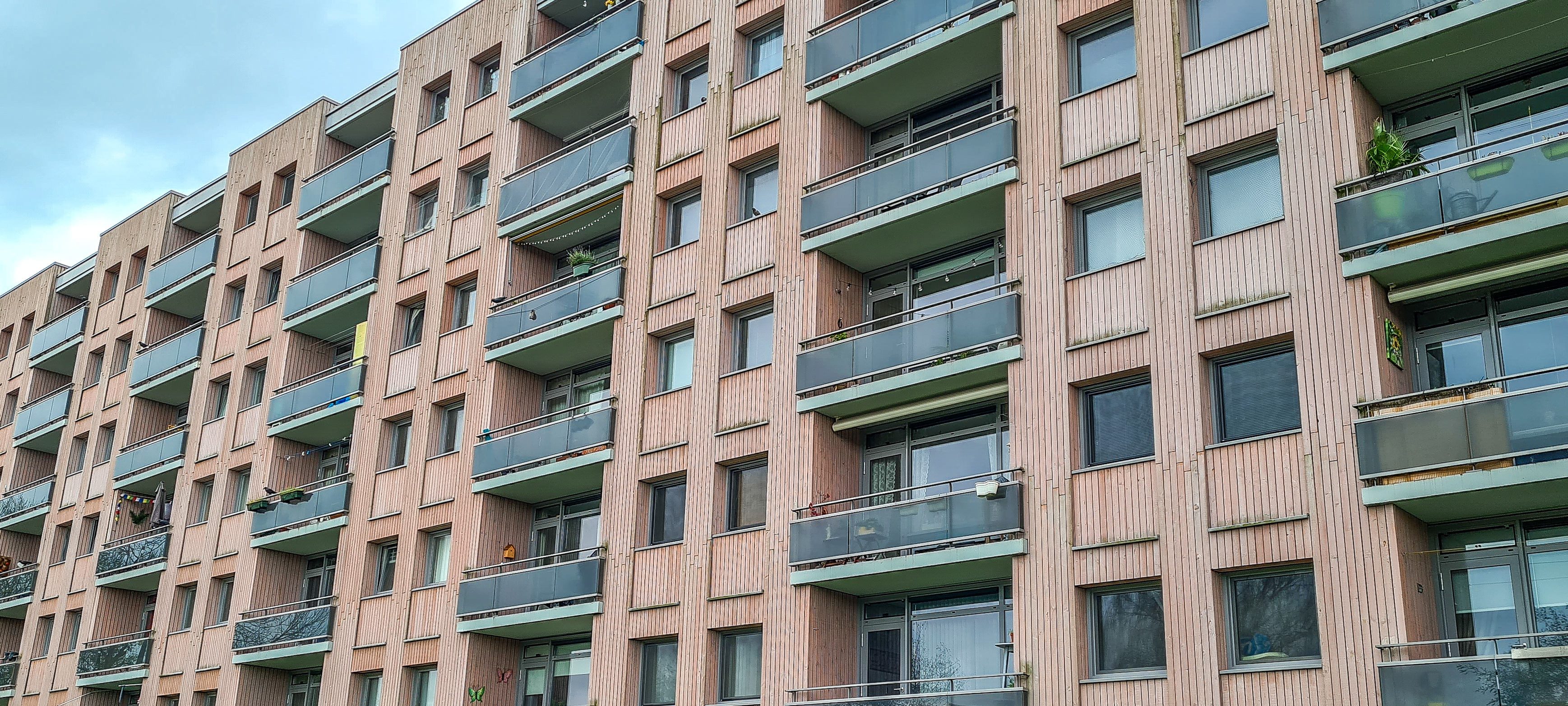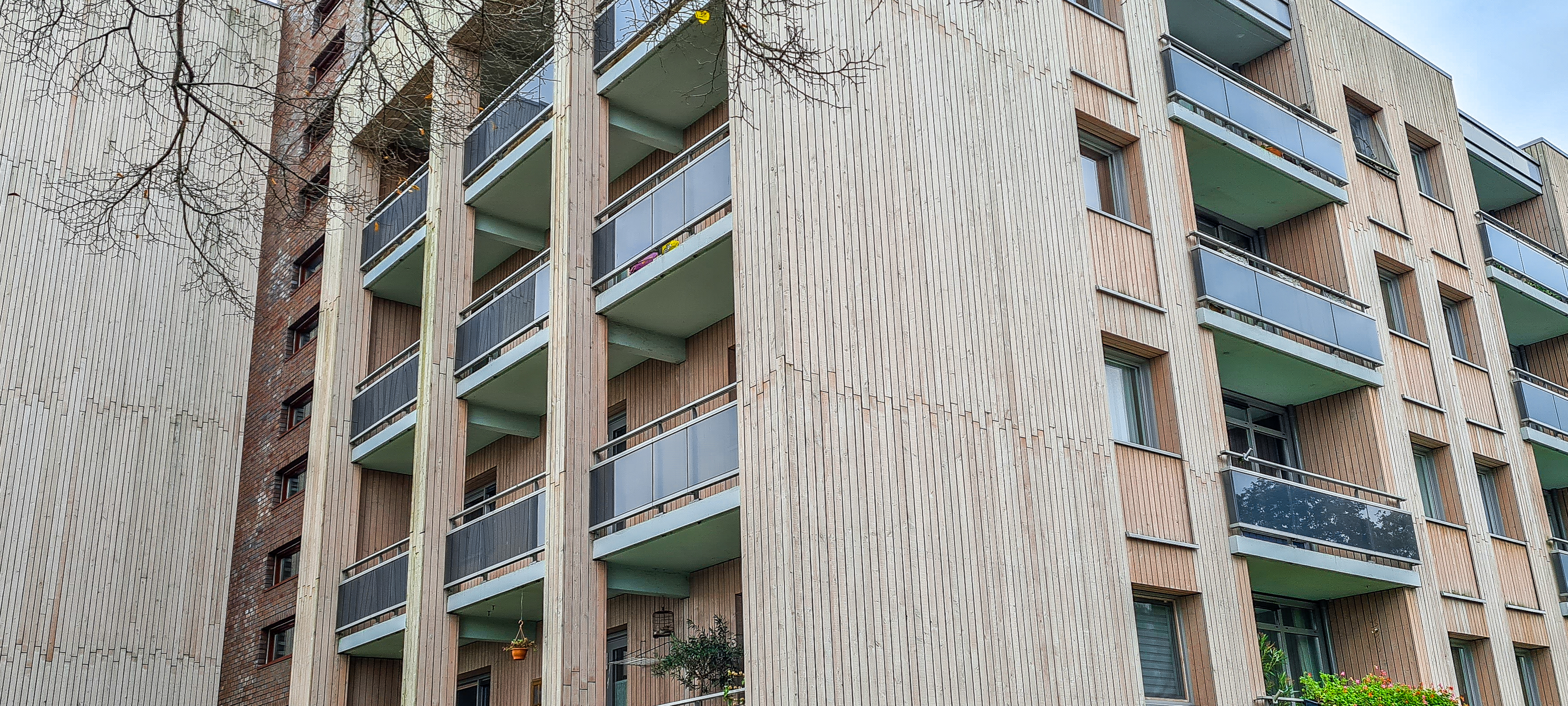 Woningbouw Weesp besloot na 45 jaar het appartementencomplex Sinnigveld in Weesp (72 woningen, 17 garages) te renoveren. FKG Architecten won de selectie voor deze renovatie. Hout was vanaf het begin het uitgangspunt. Op advies van Leegwater Houtbereiding is Douglas sorted Grade uit het Duitse Zwarte Woud toegepast als gevelbekleding. Leegwater behandelde het Douglas rondom: verduurzaming met Woodlife HL-50 (zonder metaalzouten), brandvertraging met Flame Delay PT (ook het rachelwerk) en voor de afwerking drie lagen Sansin SDF (twee keer roodbruin, één keer whitewash). De kleur roze-beige van de behandeling met Sansin SDF sluit nauw aan bij de tint van de baksteen.